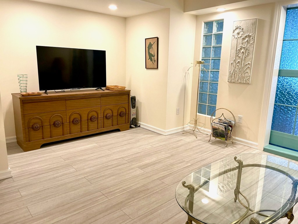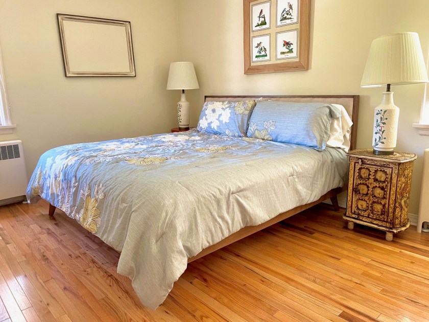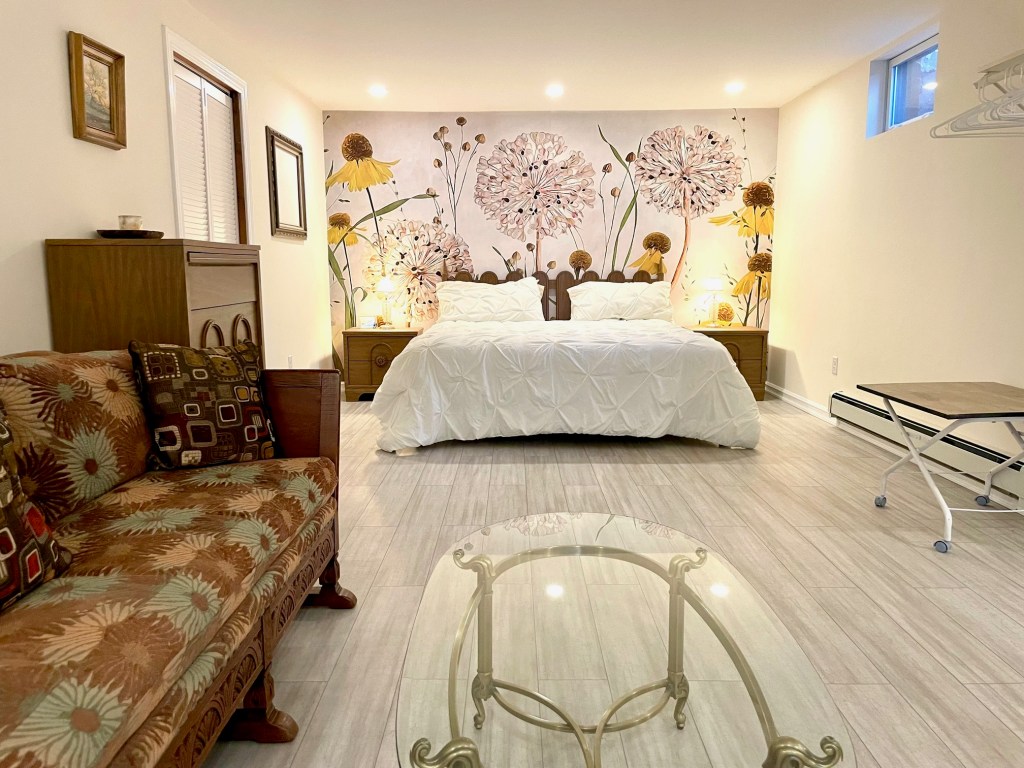 The freshly updated basement has a king bedroom with seating area and a TV. As well a separate kitchenette with tea kettle, coffee maker and microwave. This is a perfect place for a couple who needs more privacy or the loud snoring uncle. The unfinished portion of the daylight basement includes a rec space with a ping pong table and can store bikes, winter recreational gear and fishing gear. A queen air mattress and a single foldable bed is available for additional sleeping options.